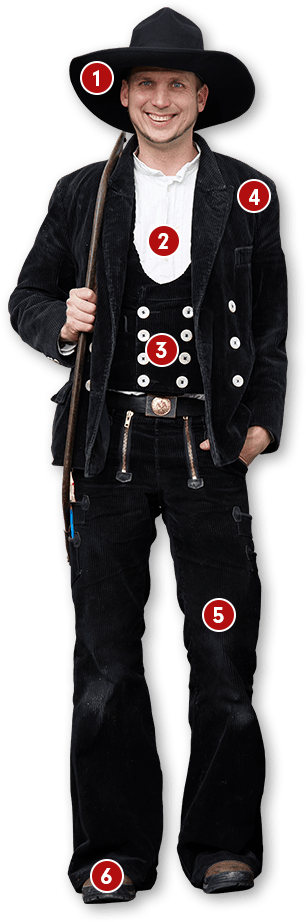 Kann ein Schlapphut, Zylinder oder ein Koks (Melone) sein, muss schwarz sein und wird eigentlich nie abgenommen, da er als Zeichen des ehrbaren Mannes gilt.